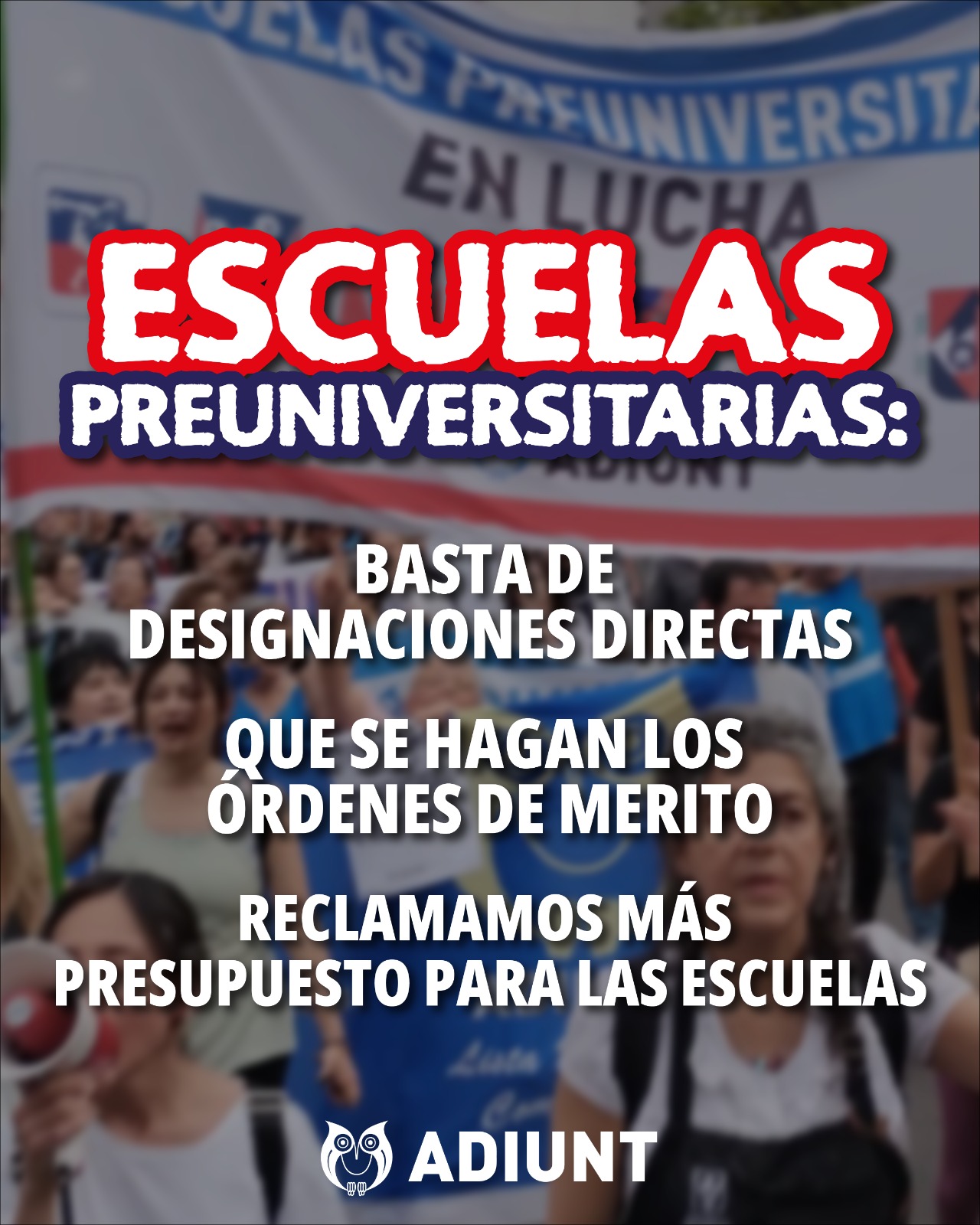 Desde la ADIUNT queremos denunciar nuevamente el uso de las designaciones directas para la cobertura de vacantes en las Escuelas Preuniversitarias. Cuando hay que cubrir interinamente horas de una asignatura, se debería utilizar el Orden de mérito actual o anterior, o bien, realizarlo de manera inmediata en función de los antecedentes que la docencia presenta en cada llamado de Interinatos y Suplencias.
