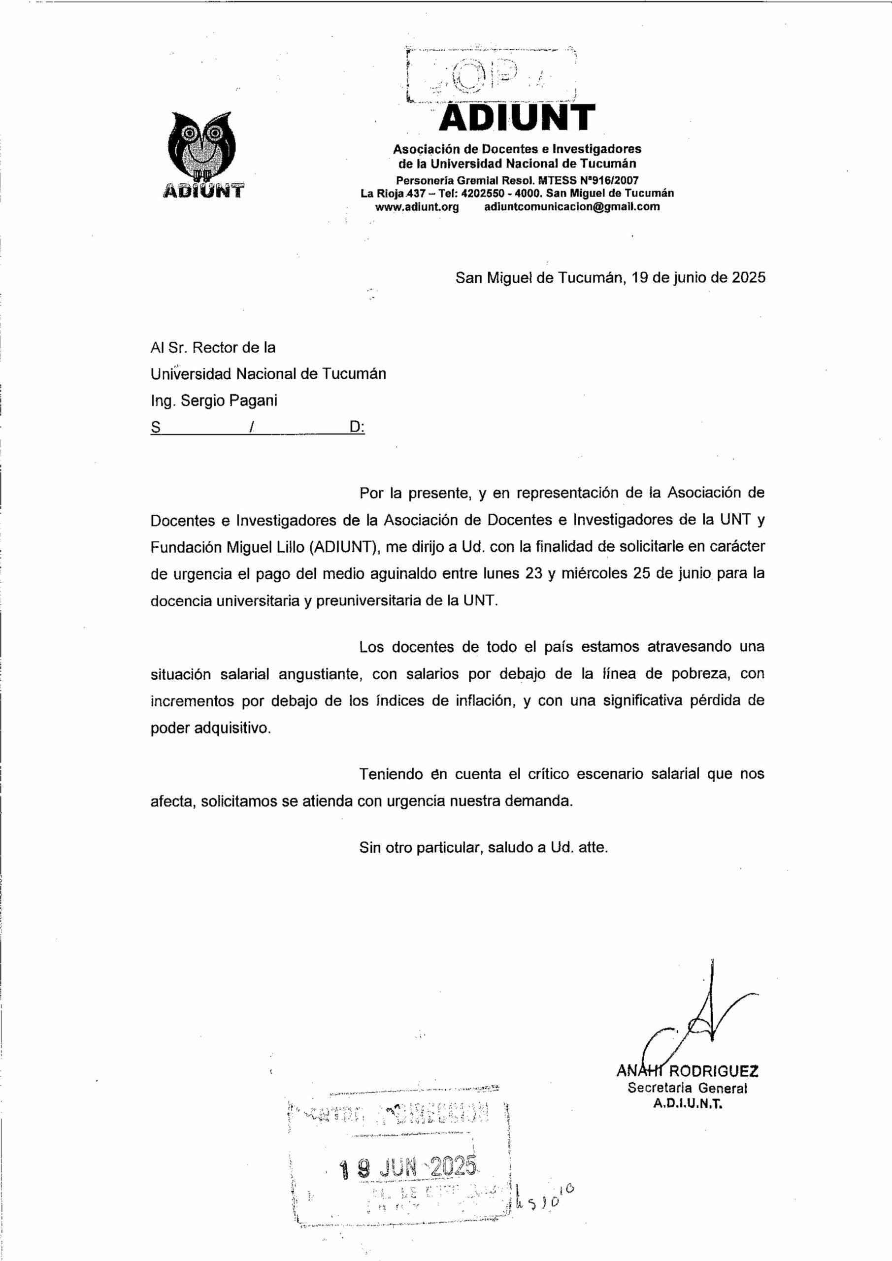 Desde la ADIUNT hemos solicitado a las autoridades de la UNT el pago del medio aguinaldo con carácter de urgencia los primeros días de la semana del 23 de junio, atendiendo a la angustiante situación salarial que atraviesa la docencia universitaria y preuniversitaria.