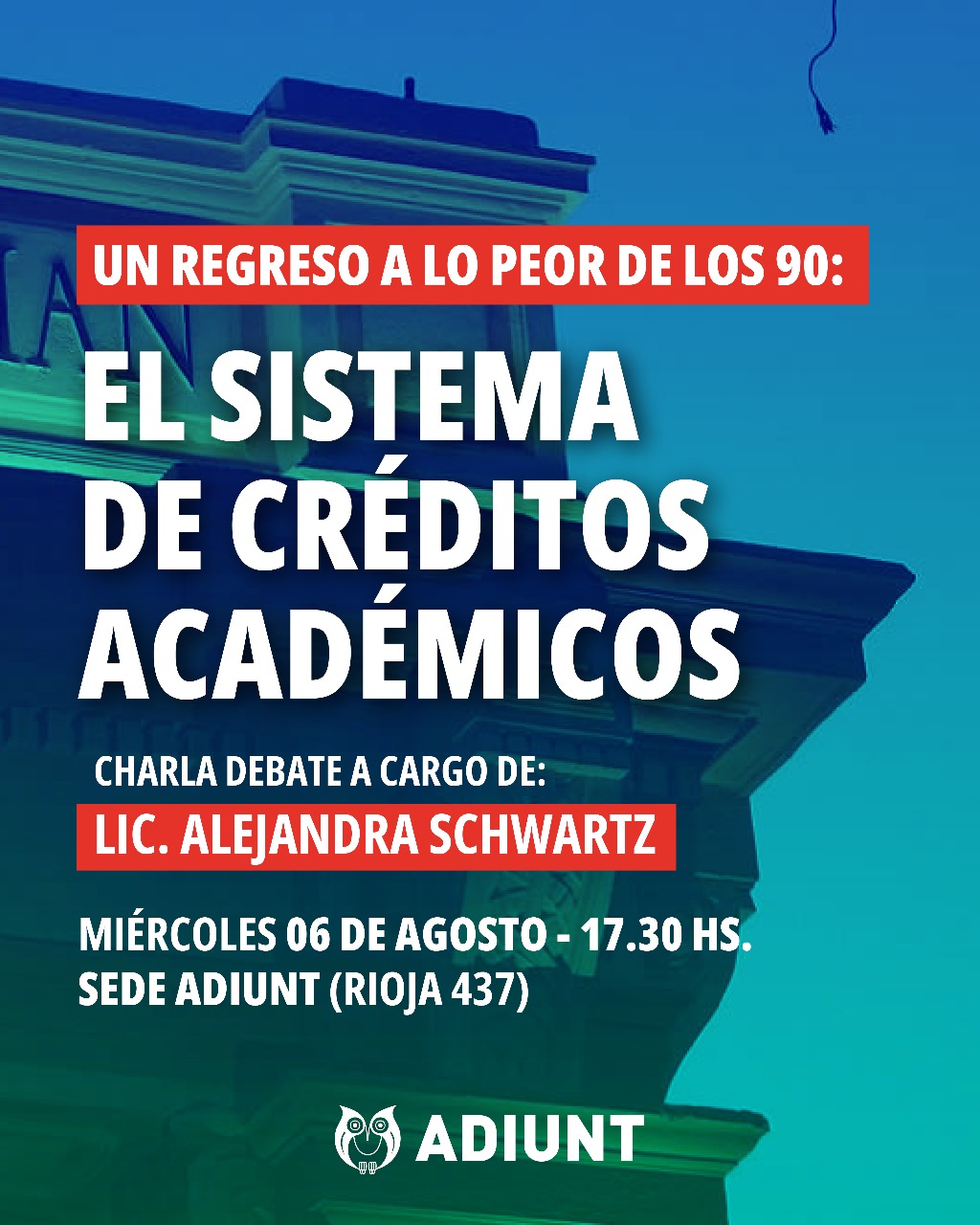 La ADIUNT invita a docentes e investigadores a participar de la charla-debate a cargo de Alejandra Schwartz, Lic. en Historia y docente de la Facultad de Filosofía y Letras (UNT) en la que se abordará críticamente el nuevo Sistema Argentino de Créditos Académicos Universitarios (SACAU) y sus implicancias para la universidad pública.