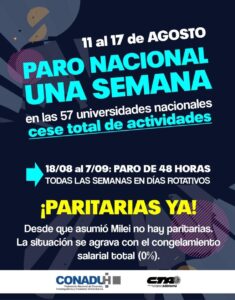 El martes 5 de agosto de 2025, sesionó el Congreso Extraordinario de CONADU Histórica que resolvió las medidas fuerzas para el nuevo tramo del plan de lucha por la recomposición de los salarios de la docencia de las universidades nacionales. La federación definió un mes completo con medidas, comenzando con un paro de una semana, con cese total de actividades, del 11 al 17 de agosto, y desde el 18 de agosto hasta el 7 de septiembre, continuar con paros de 48 horas, todas las semanas, en días rotativos, promoviendo la unidad de acción con el resto de las entidades gremiales. El Congreso sesionó bajo la presidencia honoraria de Lolín Rigoni, Madre de Plaza de Mayo de Neuquén, quien falleció hoy a los 100 años.