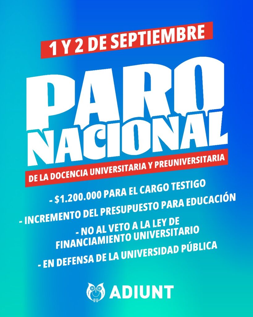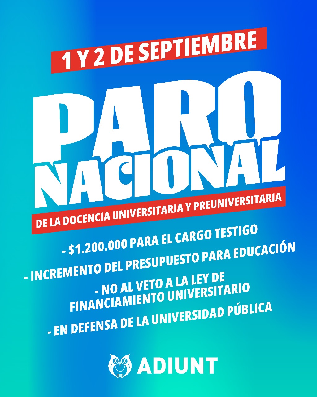 La docencia universitaria y preuniversitaria realizará un paro nacional de 48 horas los días 1 y 2 de septiembre, en el marco del plan de lucha nacional iniciado al comienzo del segundo cuatrimestre con un paro de una semana y continuado con jornadas rotativas de 48 horas.