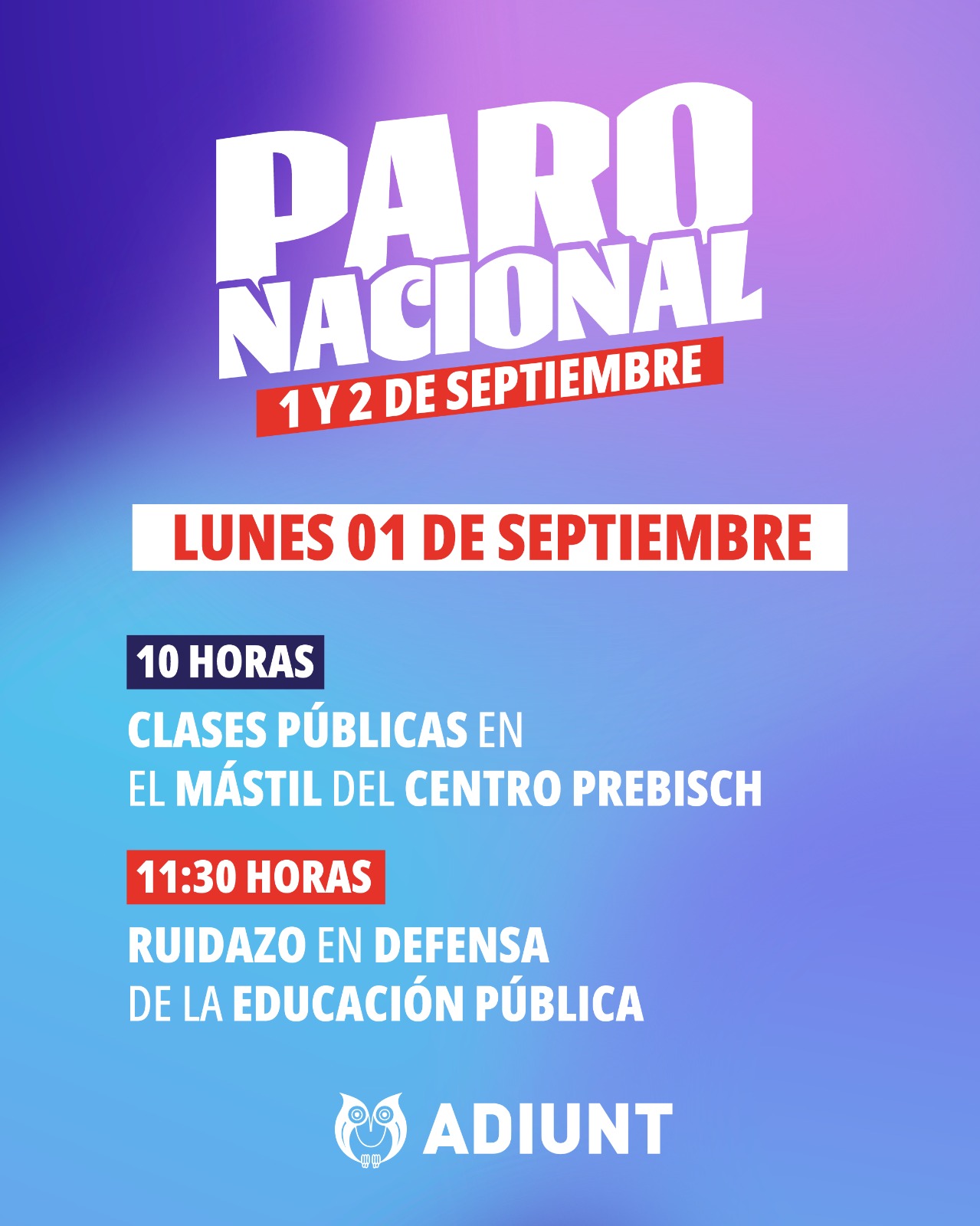 Desde ADIUNT convocamos a toda la docencia, al estudiantado y a la comunidad universitaria a sumarse activamente a estas actividades para sostener y fortalecer esta lucha.