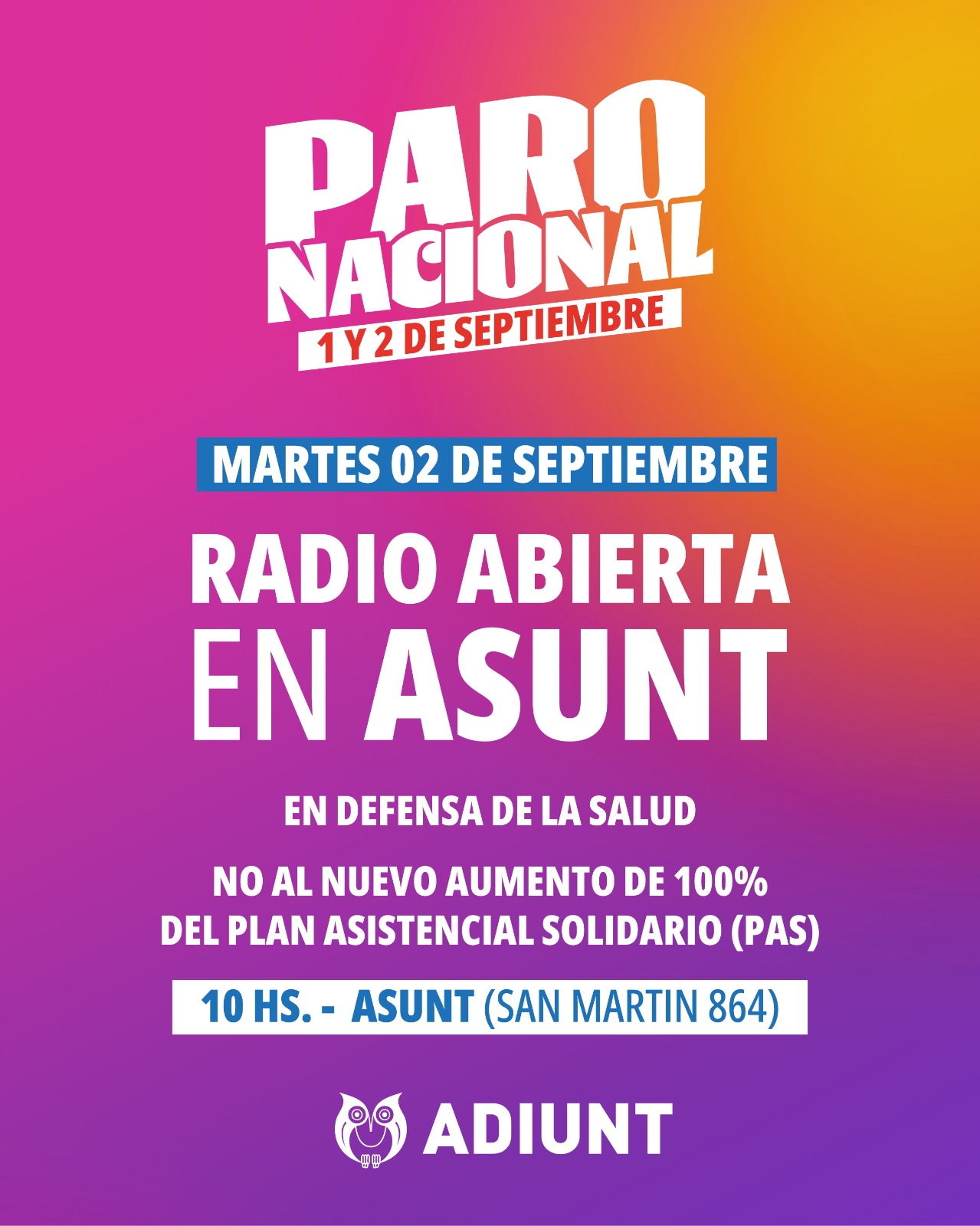 El martes 2 de septiembre, la actividad se concentrará en ASUNT (San Martín 864), donde a partir de las 10 hs se llevará a cabo una radio abierta en defensa de la salud de las y los afiliados. En este espacio se denunciará el nuevo aumento del 100% del Plan Asistencial Solidario (PAS), una medida que golpea directamente a los bolsillos de docentes, trabajadores y sus familias.
