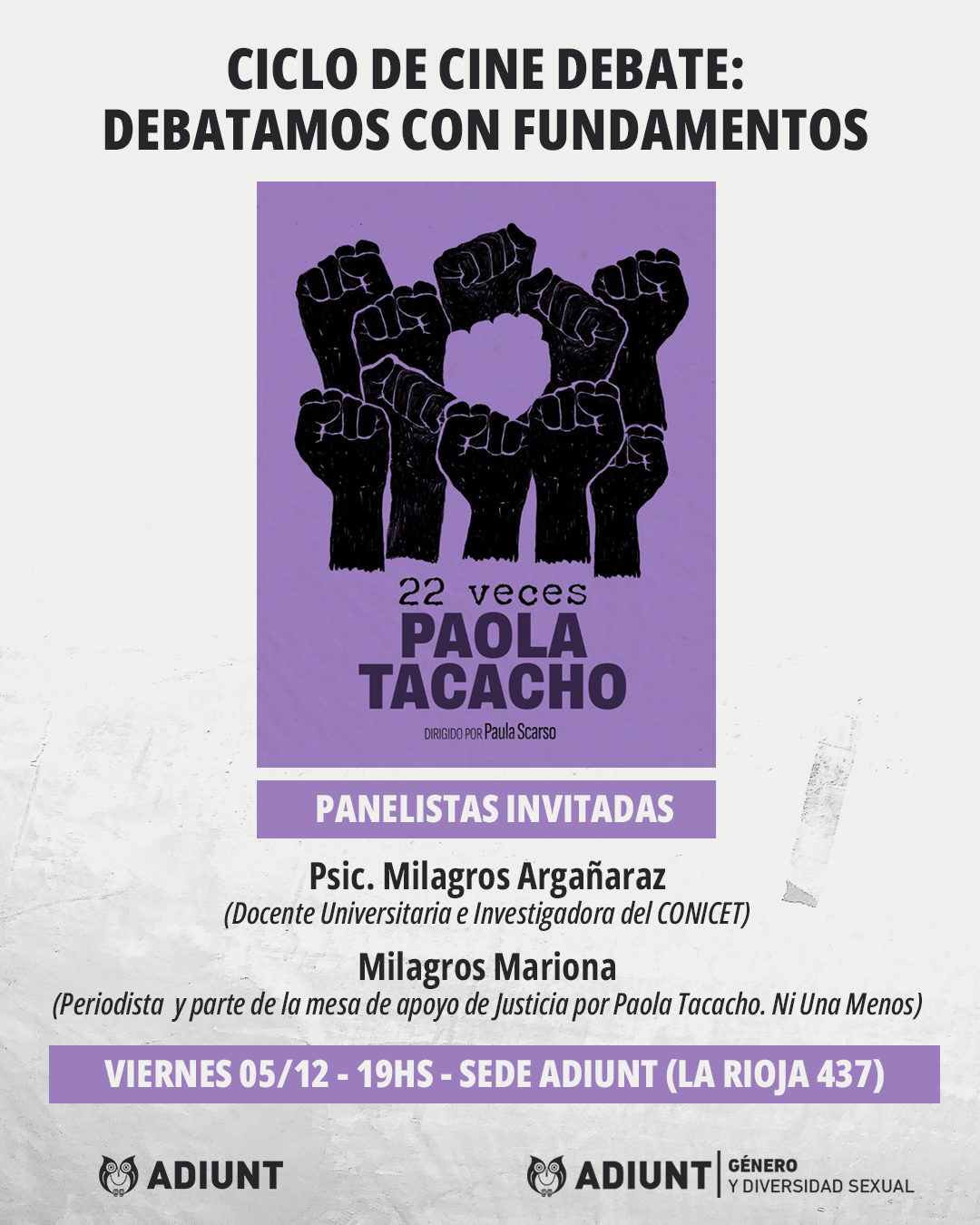 ADIUNT invita a toda la comunidad universitaria y al público en general a participar de una nueva edición del ciclo de cine-debate “Debatamos con Fundamentos”, en esta ocasión con la proyección del documental 22 veces Paola Tacacho, dirigido por Paula Scarso.