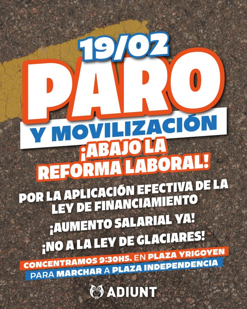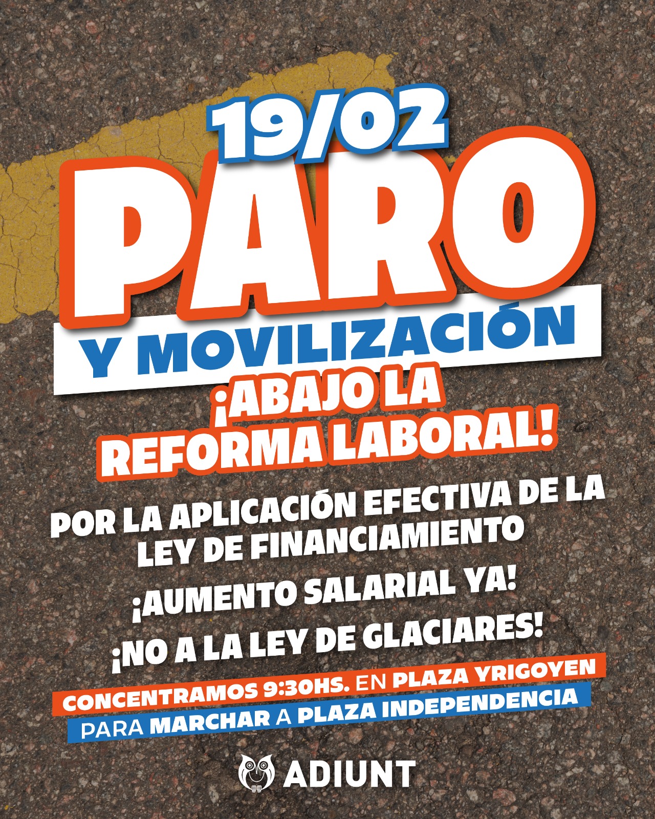 La docencia universitaria realizará el miércoles 19 de febrero un paro y movilización en rechazo a la reforma laboral impulsada por el Gobierno nacional, que avanza sobre los derechos de las y los trabajadores y profundiza el ajuste sobre la educación pública.