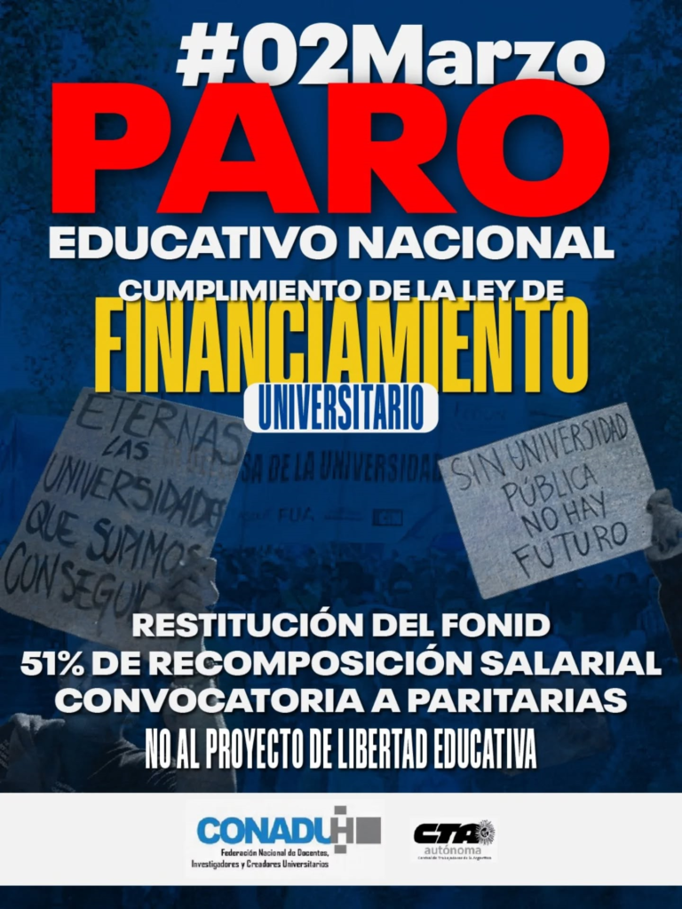 Por la defensa de la Ley de Financiamiento Universitario, por la paritaria nacional docente, por la restitución del FONID. contra el paquete de leyes regresivas que el gobierno nacional impulsa y en defensa de la educación y la universidad pública.