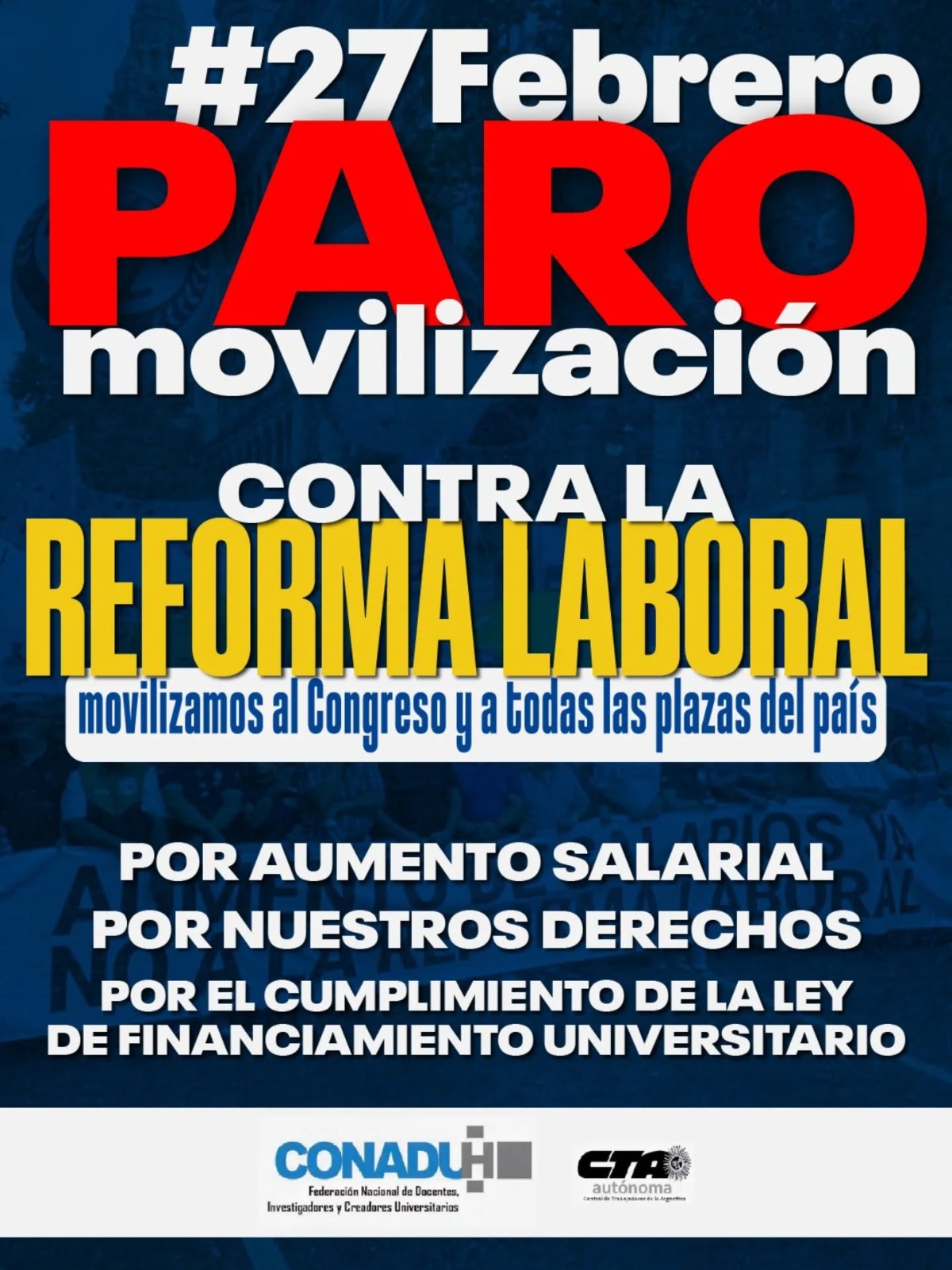 El 27 mientras en el Senado debatirá la Reforma Laboral regresiva impulsada por Javier Milei volvemos a parar para insistir en nuestro pliego: defensa de nuestros derechos laborales y defensa de nuestros salarios.