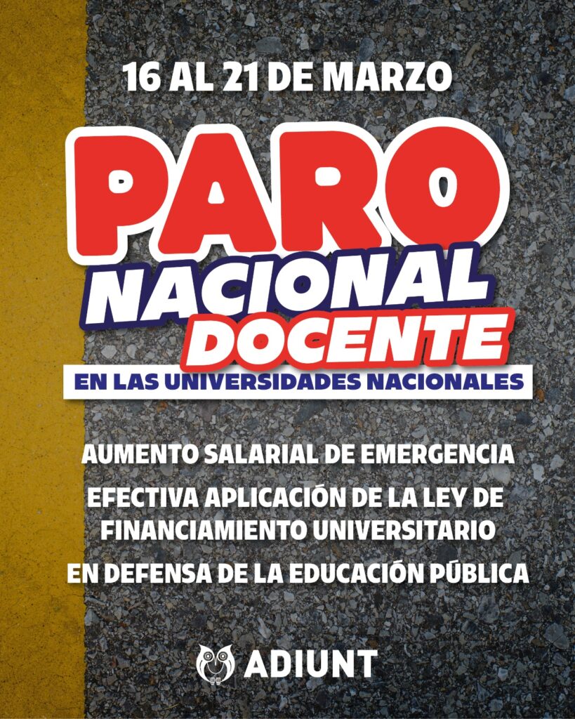 La docencia universitaria de todo el país para y se moviliza. ADIUNT se suma a la medida convocada por CONADU Histórica del 16 al 21 de marzo.