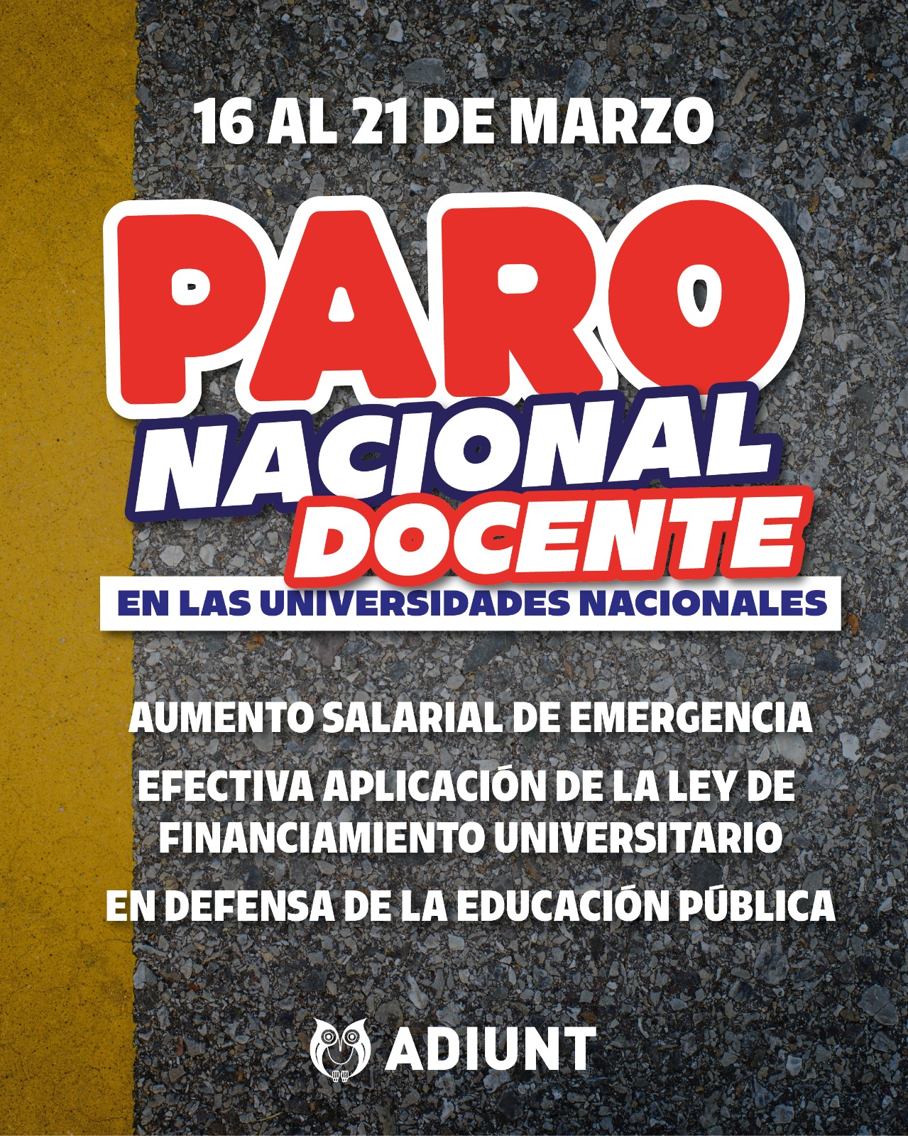 PARO NACIONAL DE UNA SEMANA: DEL 16 AL 21 DE MARZO