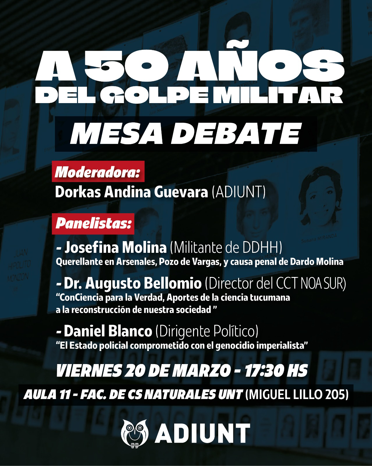 En el marco de las actividades conmemorativas por los 50 años del golpe de Estado cívico-militar, ADIUNT invita a la comunidad universitaria y al público en general a participar de la Mesa Debate “A 50 años del golpe militar”, que se realizará el viernes 20 de marzo a las 17:30 horas, en el Aula 11 de la Facultad de Ciencias Naturales de la Universidad Nacional de Tucumán, ubicada en Miguel Lillo 205.