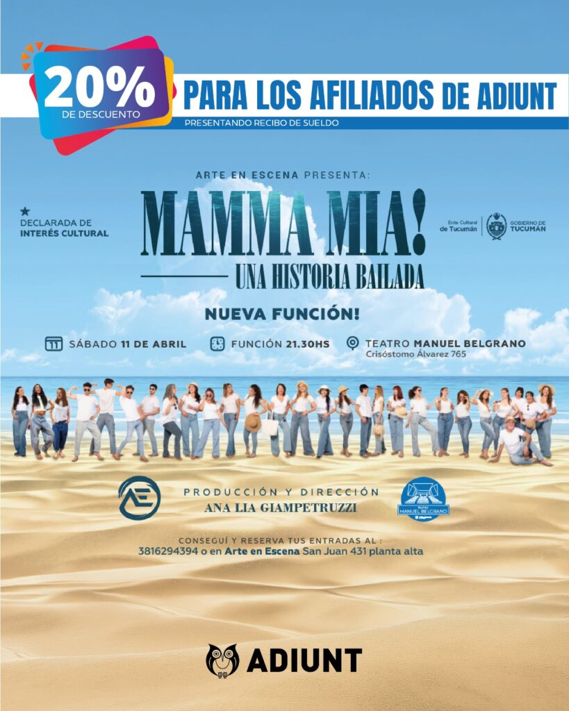ADIUNT continúa ampliando los beneficios destinados a sus afiliadas y afiliados. En esta oportunidad, quienes integran nuestro gremio podrán acceder a un 20 % de descuento en las entradas de “Mamma Mia! Una historia bailada”, una producción de Arte en Escena que se destaca por su calidad artística y su gran propuesta escénica.