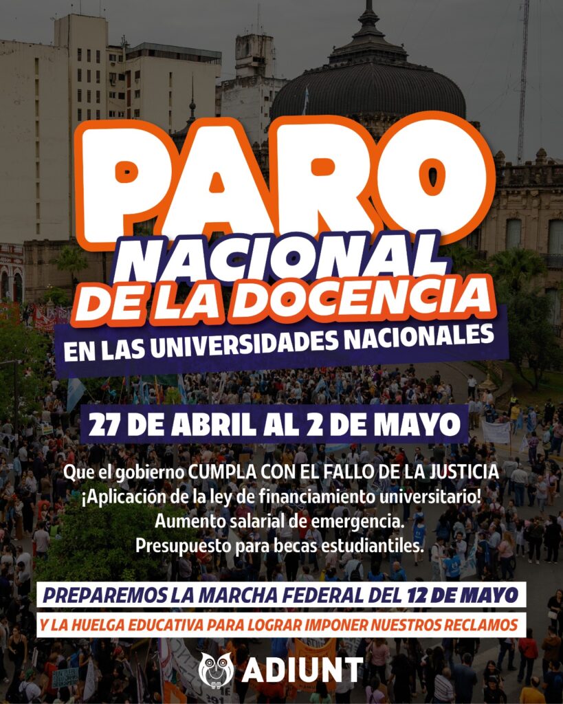 La ADIUNT informa que, en el marco de la profundización del plan de lucha a nivel nacional, la docencia de las universidades nacionales llevará adelante un paro nacional desde el 27 de abril hasta el 2 de mayo, en defensa de la universidad pública, del sistema científico, los salarios y el presupuesto.