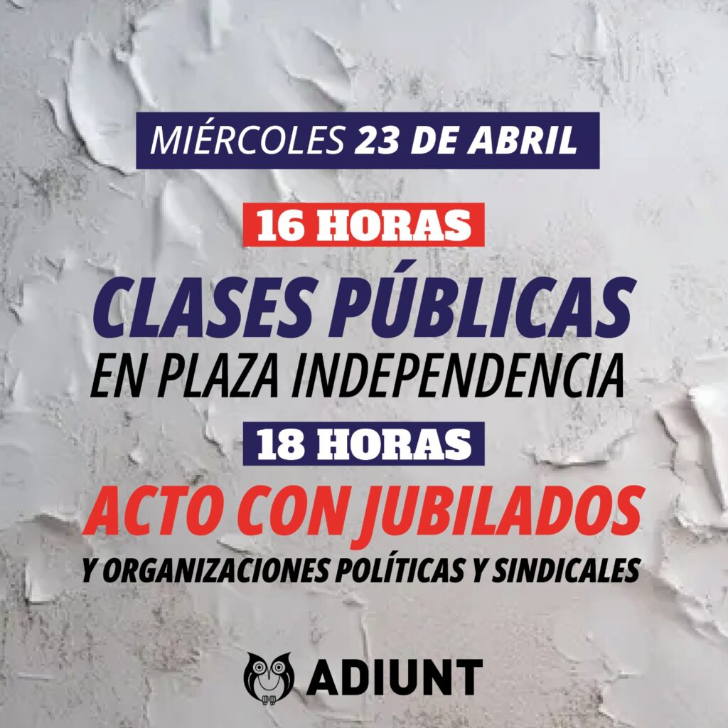 En el marco del paro nacional universitario de 48 horas, este miércoles 23 de abril, desde las 16 hs, la docencia universitaria y preuniversitaria nucleada en ADIUNT llevará adelante una jornada de clases públicas en Plaza Independencia. La actividad contará con la participación de docentes y estudiantes de distintas facultades.