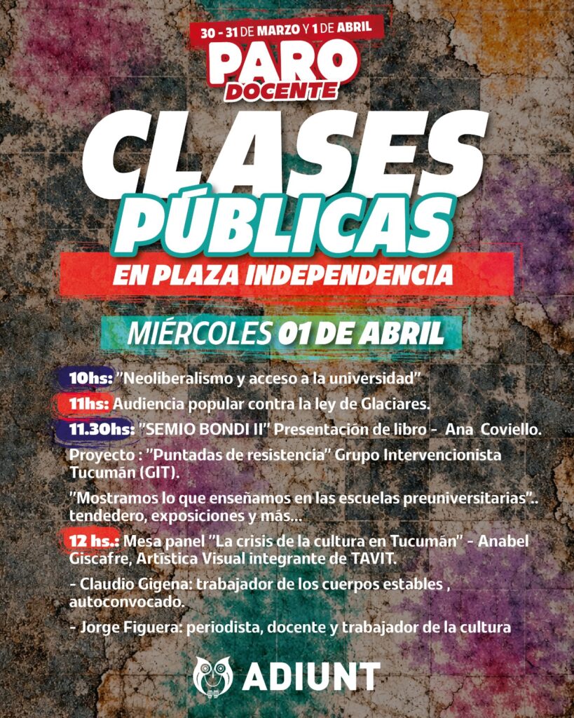 Este miércoles 1 de abril en el marco del paro nacional de la docencia universitaria y preuniversitaria, se llevará a cabo una jornada de clases públicas en Plaza Independencia a partir de las 10 hs de la mañana, con actividades abiertas destinadas a visibilizar el conflicto y compartir con la comunidad los contenidos que se enseñan en la universidad pública.