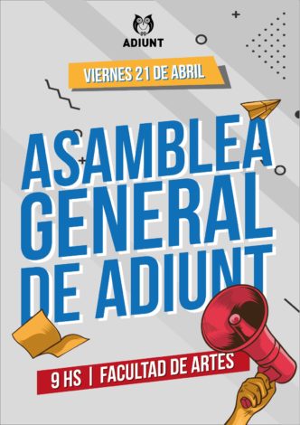 El VIERNES 21 DE ABRIL convocamos a ASAMBLEA GENERAL de ADIUNT a las 09.00 hs. en la Facultad de Artes, para debatir …