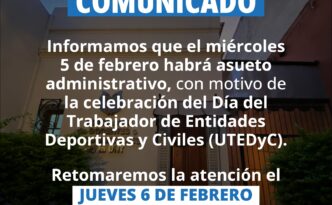 Informamos que el miércoles 5 de febrero habrá asueto administrativo, con motivo de la celebración del Día del Trabajador de Entidades Deportivas …