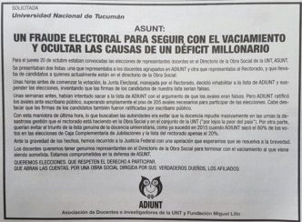 En un hecho de enorme gravedad, que se suma a los graves escándalos que caracterizan a la UNT en los últimos tiempos, la Junta Electoral de la UNT resolvió de un modo ilegítimo e ilegal, proscribir la Lista “ADIUNT en LUCHA “ del proceso electoral. Este FRAUDE ELECTORAL tiene por objeto evitar la realización de Elecciones en las que la docencia iba a expresar su bronca y malestar hacia la gestión del Rectorado en la Acción Social, como lo hizo el año pasado en Elecciones de Caja Complementaria. Las autoridades de la UNT pretenden, a través de este mecanismo fraudulento, que la Junta Electoral proclame los 3 Directores Docentes de la Lista del Rectorado. Hoy a las 11 horas, protesta en Asunt (Con Suspensión de Actividades de 10:30 a 13 hs.).