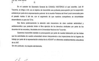 Por medio de una nota presentada al rector de la UNT, el Secretario General de Conadu Histórica, Luis Tiscornia, manifestó su preocupación …