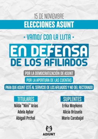 Desde la ADIUNT manifestamos, en relación a las elecciones de ASUNT (Estamento Docente) del próximo 15 de noviembre, nuestro apoyo incondicional …