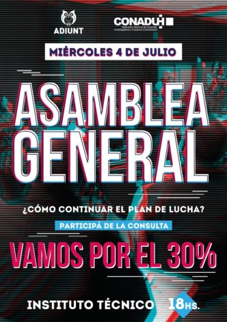 La Asamblea General de ADIUNT reunida el 4 de julio resolvió llevar como mandato al Congreso Extraordinario de CONADU Histórica el NO …