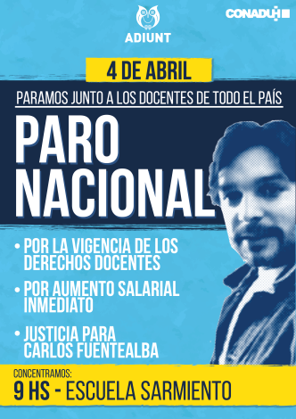 LUNES 4 DE ABRIL: PARO NACIONAL DOCENTE Y CONCENTRACIÓN EN LA ESCUELA SARMIENTO