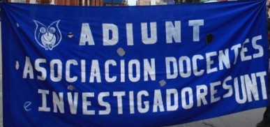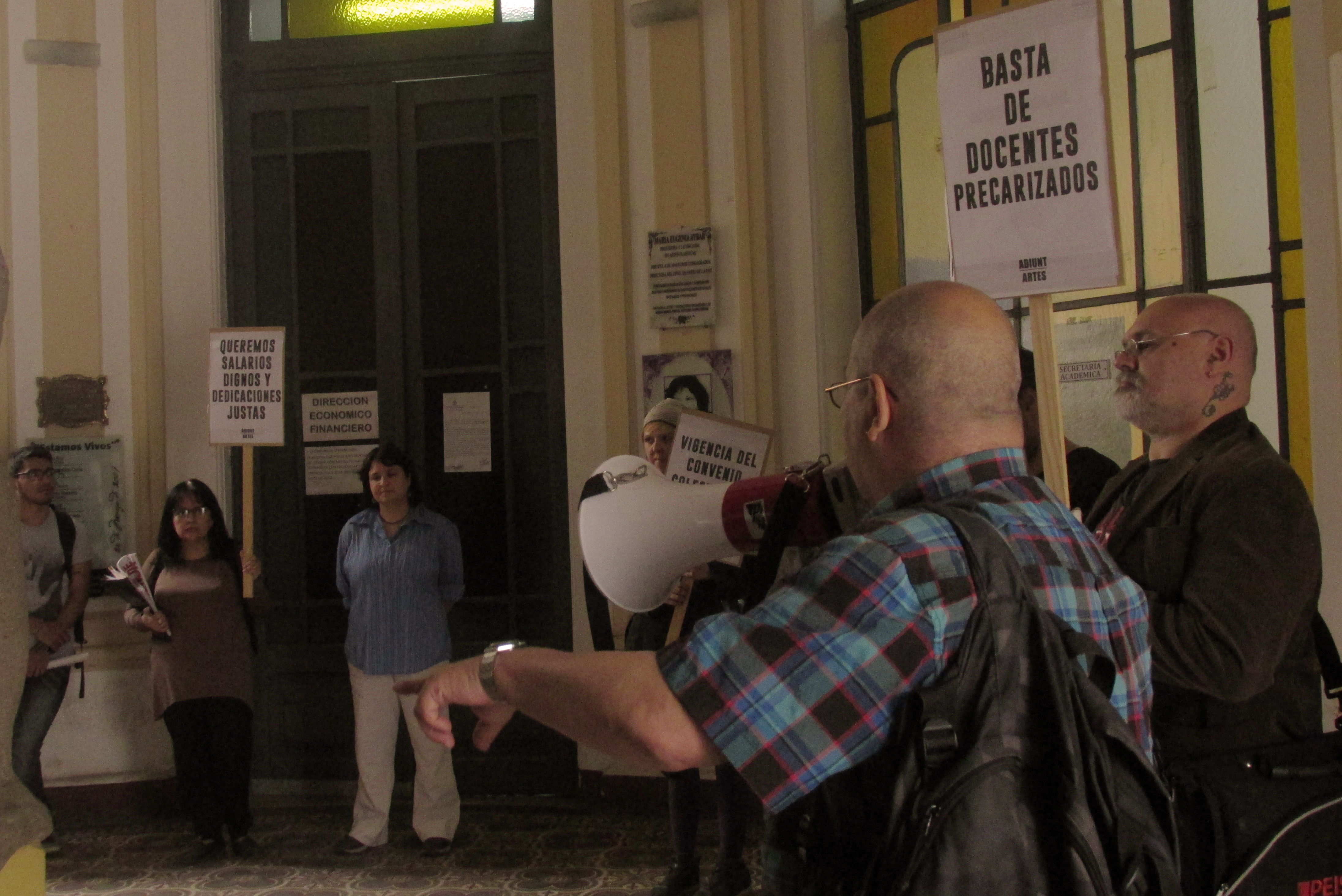 Un grupo de docentes convocados por ADIUNT-Artes reclamó este mediodía -acompañados por algunos estudiantes de la Lista de Delegados-, contra la precarización laboral. En el hall de la Facultad de Artes, el vocal Jorge Figueroa contó que cerca de una decena de docentes tienen cargos simples, pero prácticamente están a cargo de cátedras de 200 alumnos.