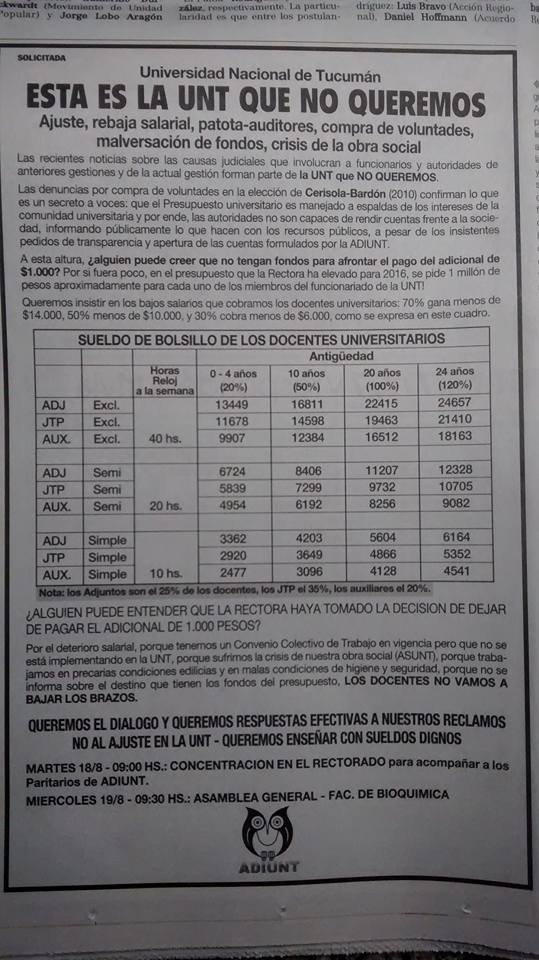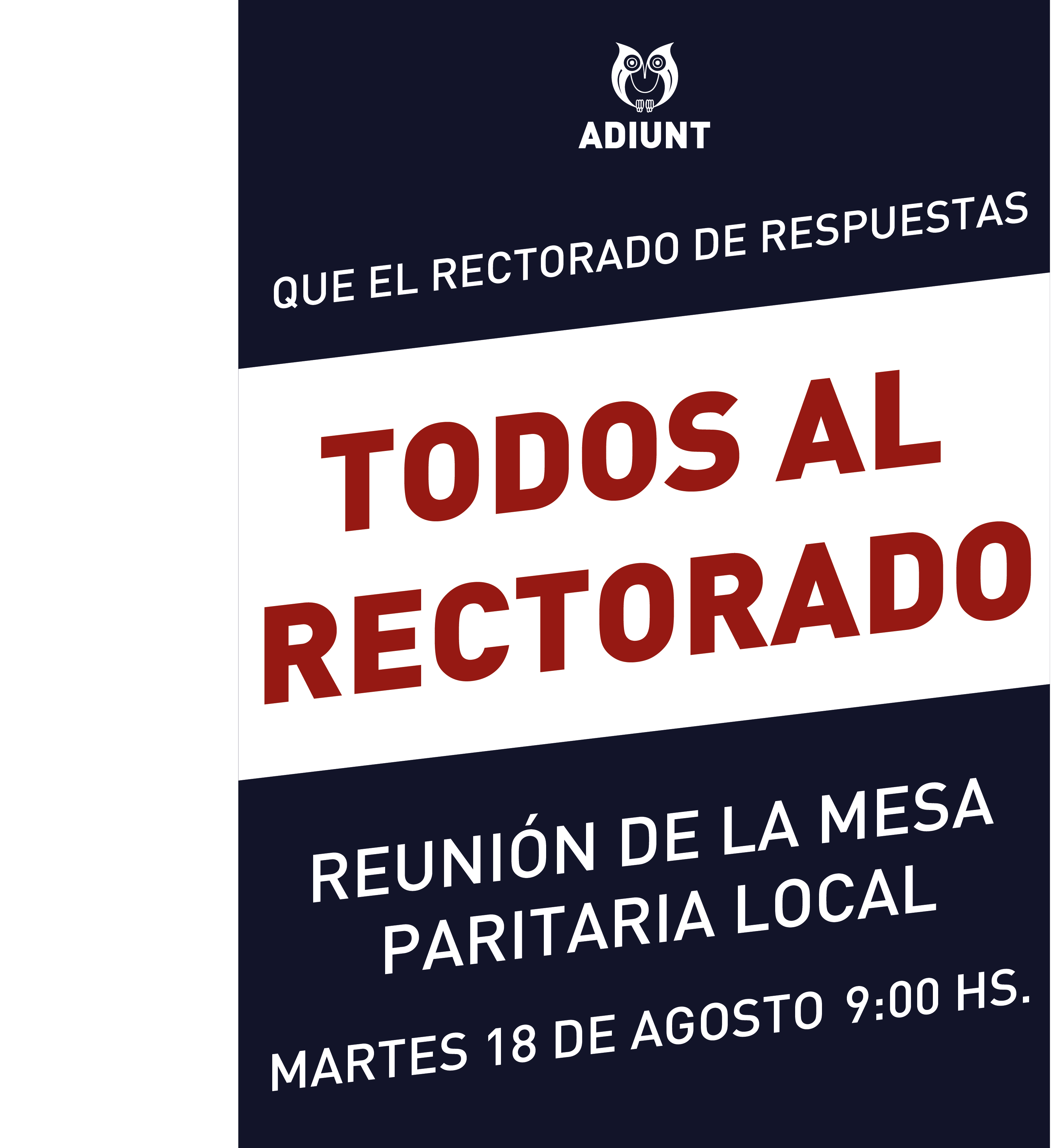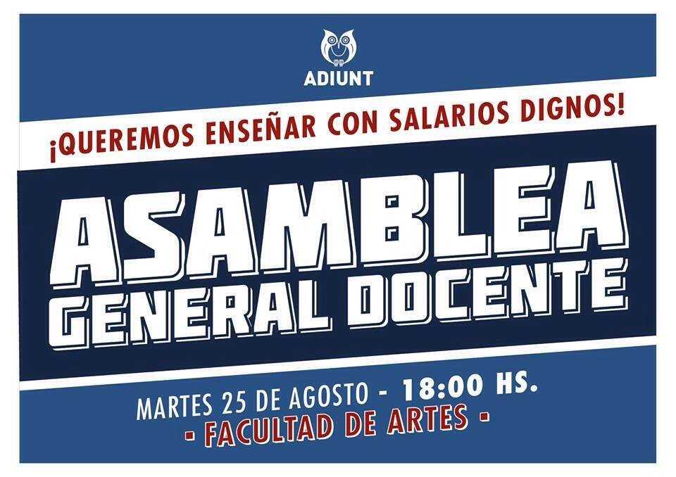 Con una muy numerosa concurrencia docente, la Asamblea General reunida este miércoles 19/8 en la Facultad de Bioquímica, decidió continuar con el paro sin asistencia a los lugares de trabajo en contra de la rebaja salarial que quiere implementar la UNT, por la aplicación efectiva del Convenio Colectivo de Trabajo, por la apertura y transparencia de las cuentas de la UNT, por el aumento presupuestario de emergencia y por todo el pliego reivindicativo, ya que, a casi un mes de haber comenzado la huelga, las autoridades de la UNT no dan respuestas positivas a estos reclamos.