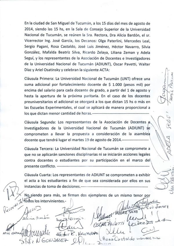 Durante la semana que va del 11 al 15 de agosto sucedieron muchos hechos que han impactado profundamente en el desarrollo del conflicto docente. Queremos ordenar las propuestas y actas que se manejaron en las reuniones que se mantuvieron con la Universidad.